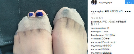 송지효는 최근 자신의 인스타그램을 통해 한 개의 사진을 게재했다. 사진 속에서는 송지효의 발인 듯한 모습이 찍혀 있다. 특히 스타킹이 ‘구멍’이 난 모습은 보는 이들의 웃음을 자아낸다.