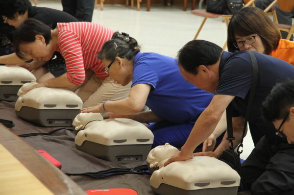 동작소방서는 지난 28일 소방서 3층 강당에서 다중이용업소 관계자를 대상으로 소방안전교육을 실시했다. 사진은 참여자들이 심폐소생술 및 응급처치요령에 대한 실습을 하는 모습.(사진제공=동작소방서)