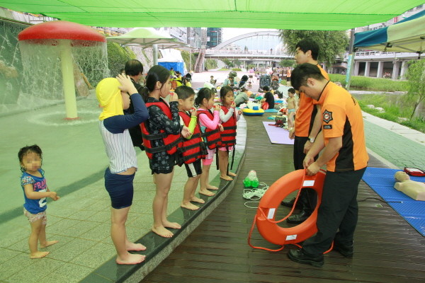 서울 관악소방서는 최근 관악구 신림동에 위치한 도림천 물놀이장을 방문해 어린이와 성인을 대상으로 안전한 물놀이를 위한 '119안전체험교육'을 실시했다. 사진은 물놀이 사고 시 대처능력 교육이 진행 중인 모습.(사진제공=관악소방서)