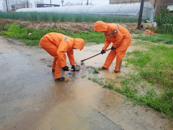 경기 안성소방서가 31일 새벽부터 시작된 폭우로 지역 곳곳에 침수와 도로 유실 등 저지대 침수사고에 대해 배수 활동을 전개하고 있다. 사진은 이날 오전 소방관들이 배수를 위해 땅을 파는 모습.(사진제공=안성소방서)