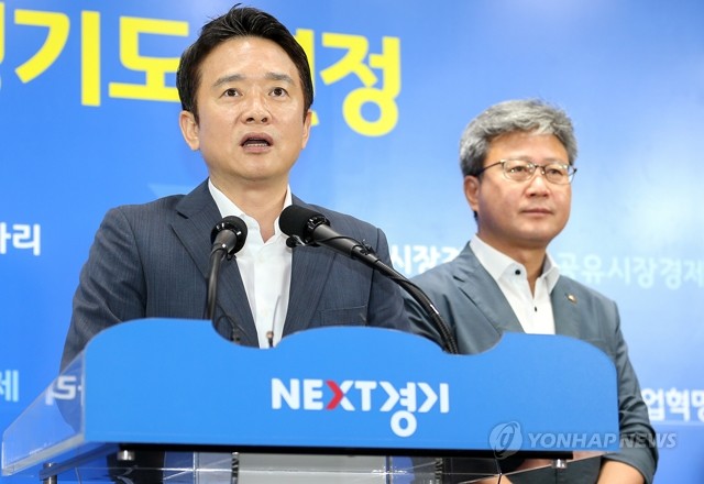 남경필 경기지사가 채인석 화성시장과 함께 도청 브리핑룸에서 기자회견을 열어 동탄2지구 부영아파트 부실시공에 대한 강력한 제재방안을 마련하겠다고 밝히고 있다.