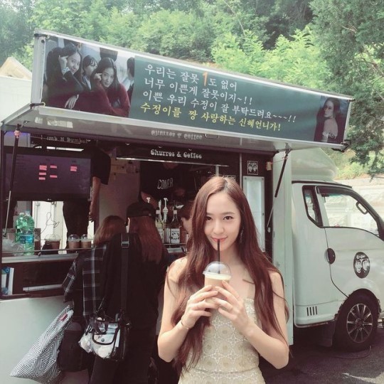 공개된 사진 속에는 베이지색 원피스를 입은 크리스탈이 커피를 들고 박신혜가 보낸 커피차 앞에서 포즈를 취하고 있는 모습이 담겨 있다.