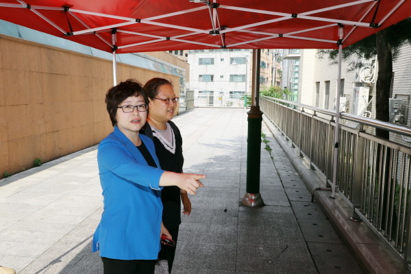 | ▲ 무더위쉼터 가림막 설치 현장을 찾은 김도연 강북구의원(앞)이 이용 불편사항 등을 점검하고 있다. | ||
