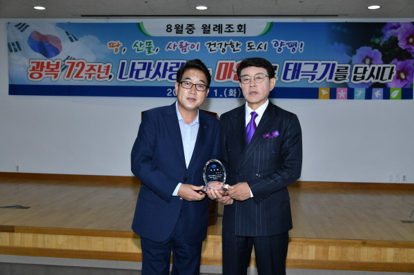 경기 양평군은 1일 오전 군청 대회의실에서 가수 설운도씨를 군 홍보대사로 위촉하는 ‘홍보대사 위촉식’을 개최했다. 사진은 김선교 군수(왼쪽)가 설씨를 홍보대사로 위촉한 후 함께 기념촬영을 하는 모습.(사진제공=양평군청)