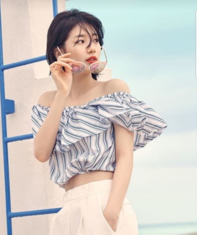수지는 짭게 커트된 헤어에 오프숄더 블라우스에 반바치 차림으로 한 손으로 선글라스를 든채 한쪽을 바라보고 있다.