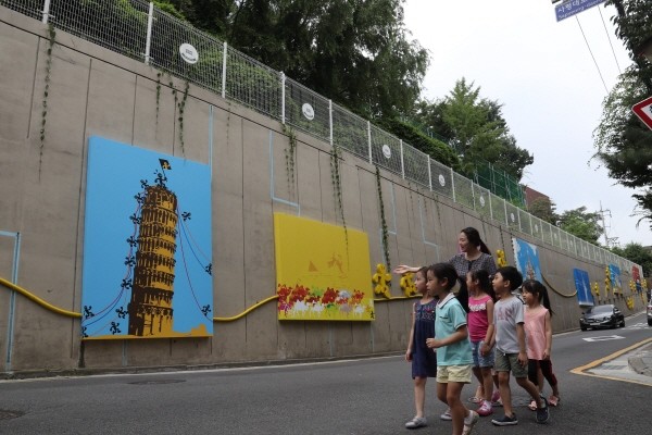 2일 오전 서초구 방배중학교 담벼락에 피사의 사탑 등 세계 랜드마크를 표현한 대형 그림 액자와 부조물이 설치돼 어린이집 어린이들이 그림을 보며 길을 건너고 있다. 구가 도시미관 개선과 범죄예방을 위해 설치한 이 그림들은 팝아트 작가 김일동씨의 작품이다.