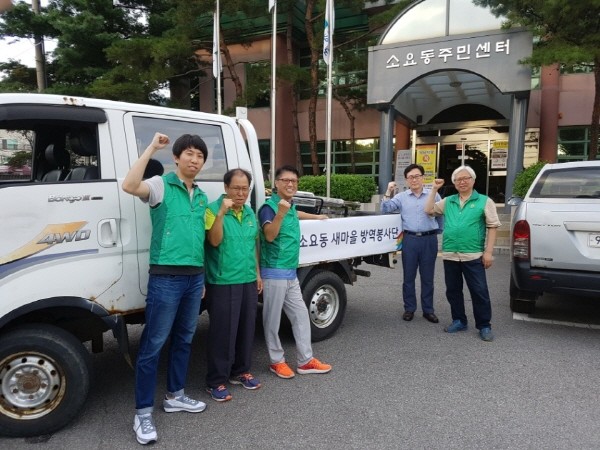 경기 동두천시 소요동 새마을지도자협의회는 지난 1일 소요동 주민센터에서 새마을 방역봉사단 발대식을 갖고 본격적인 방역활동을 시작했다. 사진은 관계자들이 방역차 앞에서 파이팅을 외치는 모습.(사진제공=동두천시청)