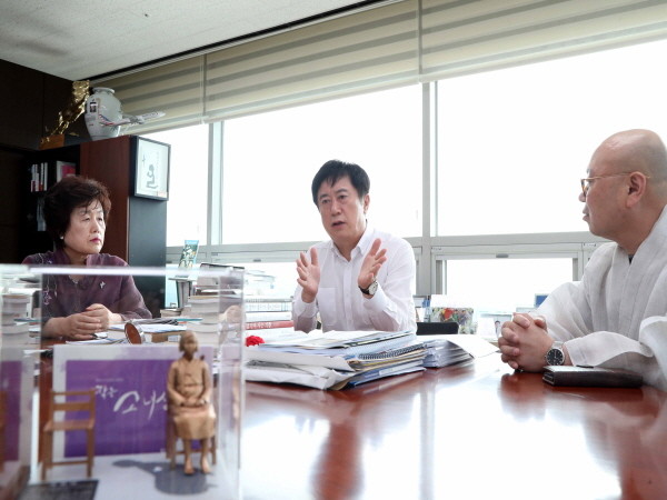 정찬민 경기 용인시장은 2일 오전 소녀상 건립을 추진하고 있는‘용인 평화의 소녀상 건립 시민추진위원회’ 공동대표인 오영희 씨와 도원스님(동도사 주지)을 시장실로 초청해 건립장소로 시청광장을 전격 제안했다. 사진은 정 시장(가운데)이 발언하는 모습.(사진제공=용인시청)