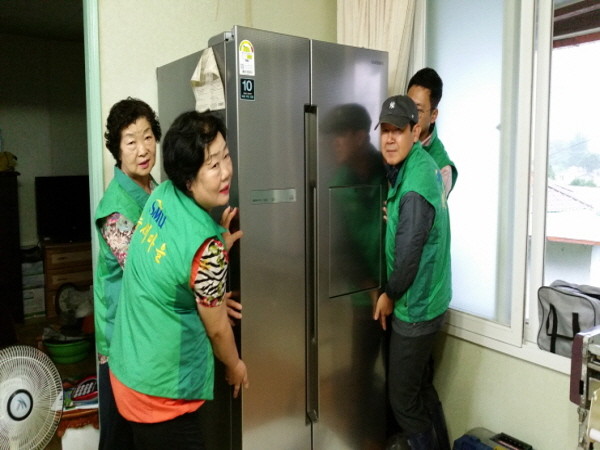 경기 안성시 고삼면 새마을부녀회 회원 10여명은 지난달 31일 이웃돕기의 일환으로 저소득 홀몸노인 집을 방문해 도배 교체를 실시했다. 사진은 참여자들이 도배를 하기 위해 냉장고를 옮기는 모습.(사진제공=안성시청)