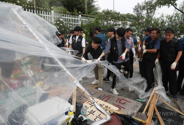 2일 오전 서울 종로구청 관계자들이 정부서울청사 앞에서 농성 중인 민주노총 투쟁사업장 공동투쟁위원회(공투위)의 천막을 철거하고 있다.