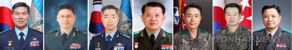 | ▲ (왼쪽부터) 정경두 합동참모본부 의장 내정자, 김용우 육군참모총장 내정자, 이왕근 공군참모총장 내정자, 김병주 한미연합사 부사령관 내정자, 박종진 제1야전군사령관 내정자, 김운용 제3야전군사령관 내정자, 박한기 제2작전사령관 내정자.(사진제공=연합뉴스) | ||