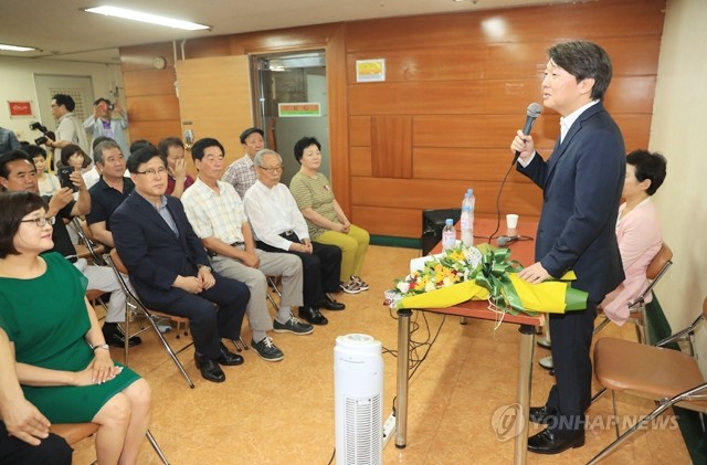 국민의당 안철수 전 대표가 8일 오후 서울 은평구 메트로타워에서 국민의당 은평을 지역당원들과 만나 대화하고 있다.