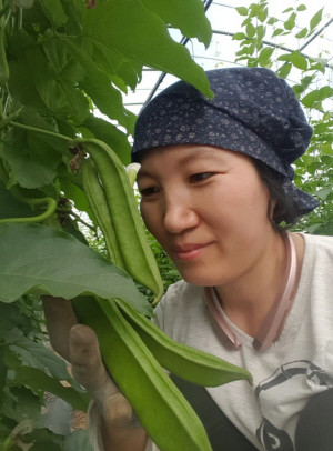 | ▲ 친환경 미생물 4종류로 땅심을 키워 재배한 작두콩을 수확하고 있는 '행복한 작두콩민지맘농장' 채미숙 대표(사진) | ||