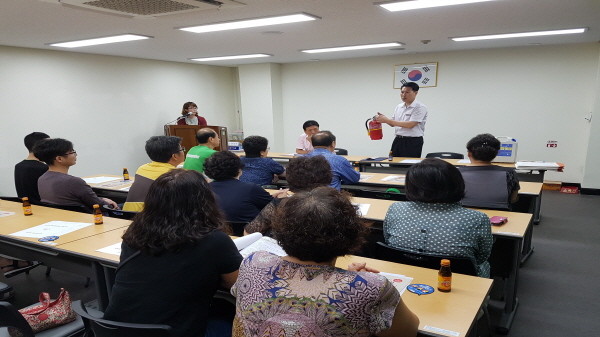 경기 하남소방서는 지난 8일 오전 덕풍3동 주민센터 2층에서 지역내 통장단 30여명을 대상으로 '소방안전교육'을 실시했다. 사진은 소방서 관계자가 소화기 사용 실습에 대해 강의하는 모습.(사진제공=하남소방서)