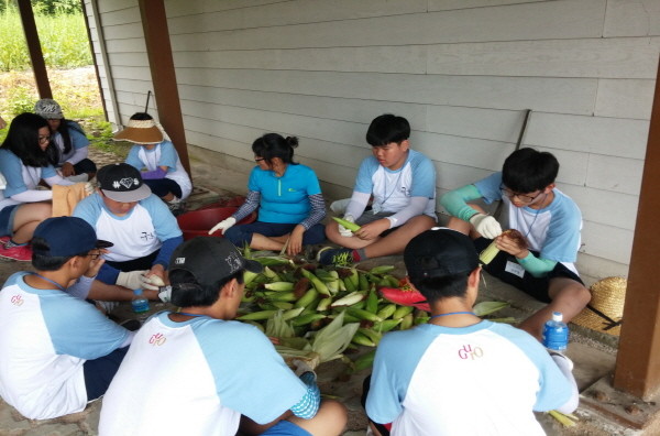지난 7일 서울 구로구가 10명의 구로구 중학생들을 대상으로 자매 자치단체인 강원도 영월군과 충북 괴산군에서 ‘1박2일 청소년 농촌체험’을 진행했다. 사진은 체험에 참가한 청소년들이 옥수수 껍질을 벗기고 있는 모습.(사진제공=구로구청)