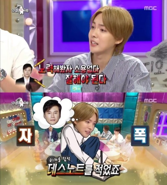 이에 김진우는 노력했던 당시를 전하며 양현석으로부터 “노력은 필요없다. 결과가 좋아야 한다는 말을 들었다”며 “하지만 그게 노력하는 사람이 들을 때는 정말 비참하다. 그래서 데스노트에 이름을 적은 적이 있다”고 말해 웃음을 자아냈다.