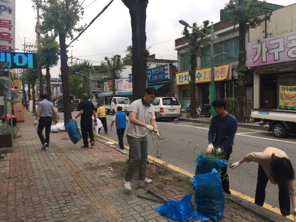 경기 동두천시 바르게살기위원회는 지난 9일 오후 6시 깨끗한 동두천시를 만들기 위해 환경정화 활동을 실시했다. 사진은 참여자들이 도로변에 무성하게 자란 잡초를 제거하는 모습.(사진제공=동두천시청)