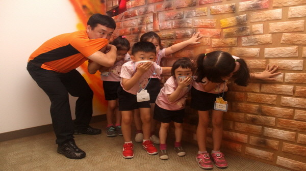서울 은평소방서는 지난 8일 시민안전체험관을 방문한 지역내 구립 대영어린이집 원생과 지도교사 40여명에 대해 어린이의 눈높이에 맞춘 화재 예방 소방안전교육을 실시했다. 사진은 어린이들이 열·연기 피난체험을 하는 모습.(사진제공=은평소방서)