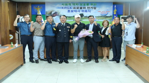 경기 연천경찰서에서는 지난 9일 소회의실에서 KPGA프로골프선수 전가람 선수를 홍보대사로 위촉하는 홍보단 위촉식을 개최했다. 사진은 전가람 선수(가운데)와 서민 경찰서장(왼쪽 네 번째) 등이 기념촬영을 하는 모습.(사진제공=연천경찰서)