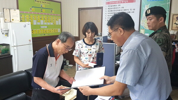 서울 도봉구 쌍문1동은 지난 7일 육군본부로부터 수여 요청된 ‘6.25전쟁 참전유공자’ 김헌수 옹의 화랑무공훈장을 김 옹의 아들인 김상근 씨에게 전수했다. 사진은 김 씨가 동 관계자로부터 훈장을 전수 받고 있는 모습.(사진제공=도봉구청)