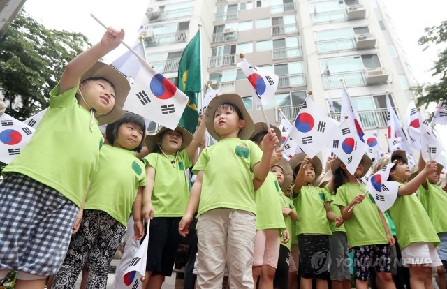 10일 오전 서울 성동구의 태극기 달기 시범아파트인 삼성쉐르빌 앞에서 어린이들이 '광복절 기념 태극기 달기' 캠페인을 벌이고 있다.