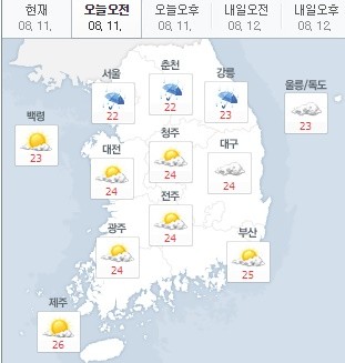 현재 서울은 22도, 춘천 22도, 대전 24도, 청주 24도, 전주 24도, 부산 25도, 광주 24도, 제주 26도를 기록 중이다.