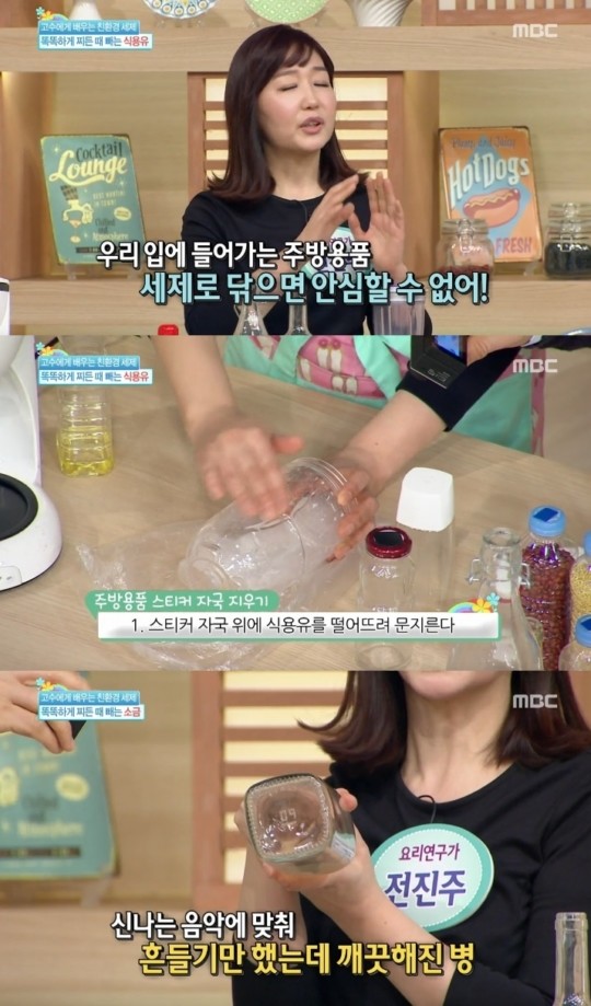 이어 전진주는 "새 주방용품에 붙어있던 상표를 떼어내면 스티커 자국이 생긴다. 이것은 식용유로 지울 수 있다"라며 "스티커 자국 위에 식용유를 떨어뜨려 문지르기만 하면 지워진다"고 설명했다.