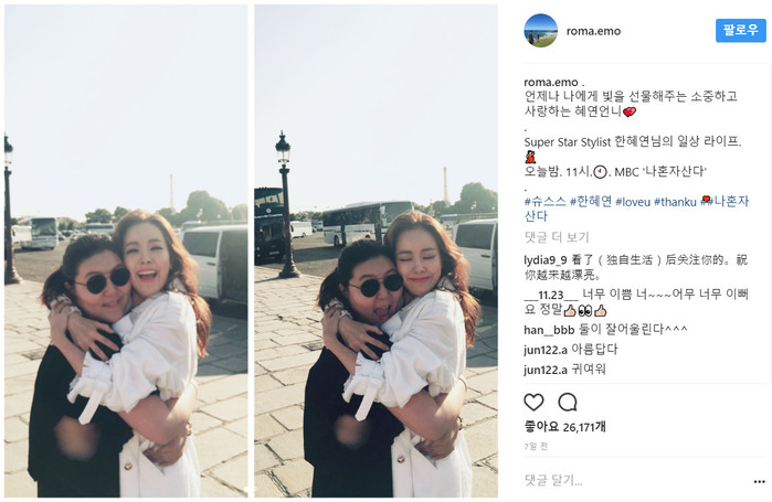 특히 둘이 끌어안고 있는 다정한 사진과 함께 "Super Star Stylist 한혜연님의 일상 라이프. 오늘밤. 11시.MBC '나혼자산다'"라는 글을 함께 게재해 더욱 관계의 돈독함을 느낄 수 있게했다.