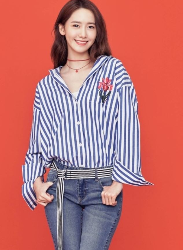 사진 속 윤아는 블루컬러 스트라이프 셔츠에 데님 팬츠, 또 같은 스트라이프 벨트를 하고 초커를 목에 맨채 카메라를 향해 환하게 웃고 있다.