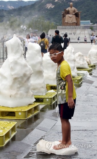 13일 오후 '한여름 밤의 눈 조각전'이 열린 서울 광화문광장에서 한 어린이가 조각난 눈 위에 올라서며 더위를 식히고 있다.