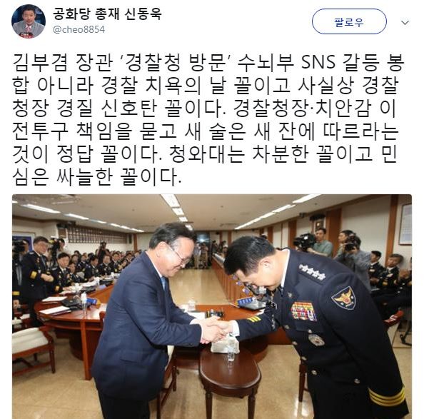 이에 이날 공화당 신동욱 총재는 자신의 트위터에 "김부겸 장관 ‘경찰청 방문’ 수뇌부 SNS 갈등 봉합 아니라 경찰 치욕의 날 꼴이고 사실상 경찰청장 경질 신호탄 꼴이다. 경찰청장·치안감 이전투구 책임을 묻고 새 술은 새 잔에 따르라는 것이 정답 꼴이다. 청와대는 차분한 꼴이고 민심은 싸늘한 꼴이다"라는 글을 게재해 눈길을 끌었다