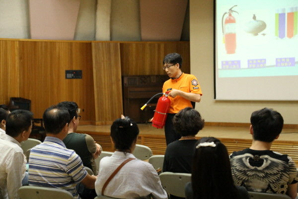 강남소방서는 지난 10일 오후 소방서 5층 강당에서 다중이용업소 관계인을 대상으로 소방안전교육을 실시했다. 사진은 소방관이 참여자들에게 소화기 사용법에 대해 설명하는 모습.(사진제공=강남소방서)