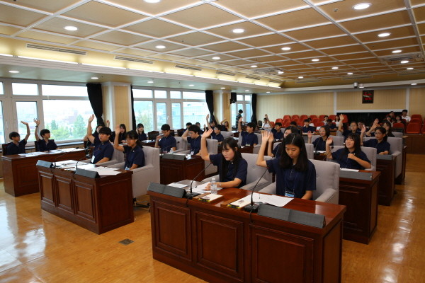 어린이와 청소년의 참여권 보장과 청소년의 자치권 확대를 목적으로 지난 6월12일 출범한 아산시 어린이·청소년 의회가 지난 10일 제1차 본회의를 개최했다. 사진은 거수표결하는 어린이·청소년 의원들의 모습.(사진제공=아산시청)