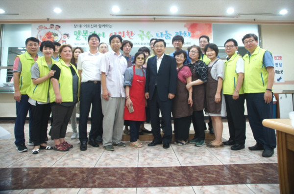 서울 도봉구 창1동 지역사회보장협의체는 지난 11일 민간복지거점기관인 창동염광교회에서 지역노인들을 대상으로 ‘말복맞이 시원한 국수 나눔 잔치’를 개최했다. 사진은 이동진 구청장과 봉사자들이 행사종료 후 기념촬영을 하는 모습.(사진제공=도봉구청)