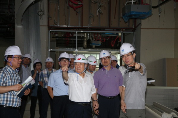 지난 11일 박홍섭 마포구청장(가운데)이 마포중앙도서관 내부를 점검하며 공사 관계자들과 담당자들에게 안전을 당부하며 지시를 내리고 있다. 마포중앙도서관은 오는 10월31일 준공예정이다.(사진제공=마포구청)