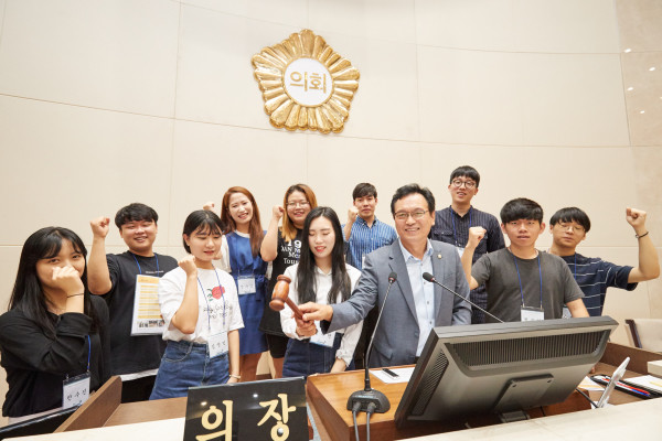 | ▲ 김중식 경기 용인시의장이 시의회를 방문한 대학생 정책자문단과 함께 기념촬영을 하고 있다.(사진제공=용인시의회) | ||