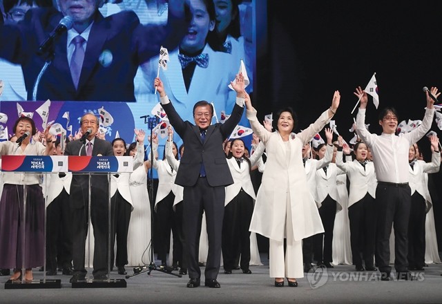 문재인 대통령과 부인 김정숙 여사가 15일 오전 세종문화회관에서 열린 제72주년 광복절 경축식에서 참석자들과 함께 만세삼창을 하고 있다.