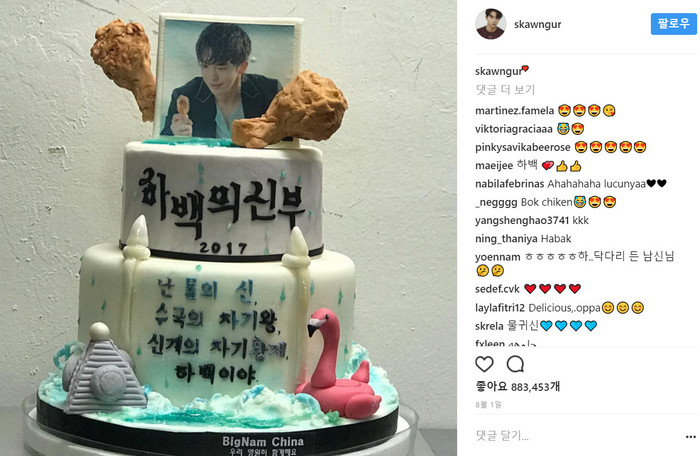 특히 사진 속 케이크에는 그가 출연한 드라마 '하백의 신부'와 관련된 문구가 써있어 더욱 눈길을 끈다.