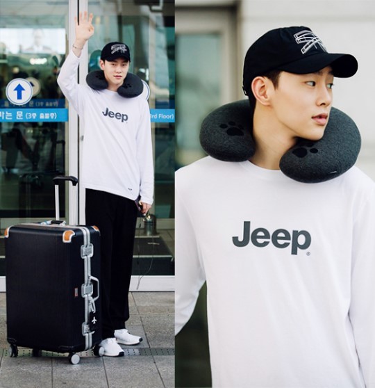 이날 권현빈은 깔끔한 화이트 스웨트 셔츠에 넉넉한 핏의 블랙 팬츠를 매치해 편안한 공항 패션을 완성했다.