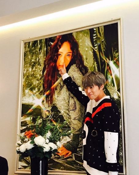 공개된 사진 속에는 tvN 월화드라마 '하백의 신부 2017'에서 무라 역으로 열연중인 크리스탈의 사진 앞에서 코믹한 표정을 짓고 있는 공명의 모습이 담겨있다.
