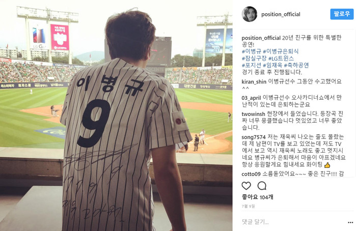 그는 공개된 사진 속에서 20년지기 친구인 LG트윈스 이병규 선수의 은퇴식이 예정되어 있는 경기를 지켜보는 모습을 보이고 있다.
