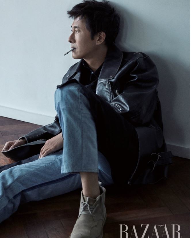 사진 속 김주혁은 블랙컬러 가죽 자켓에 데님팬츠에 담배를 하나 물고 옆모습으로 카메라를 바라보고 있다.