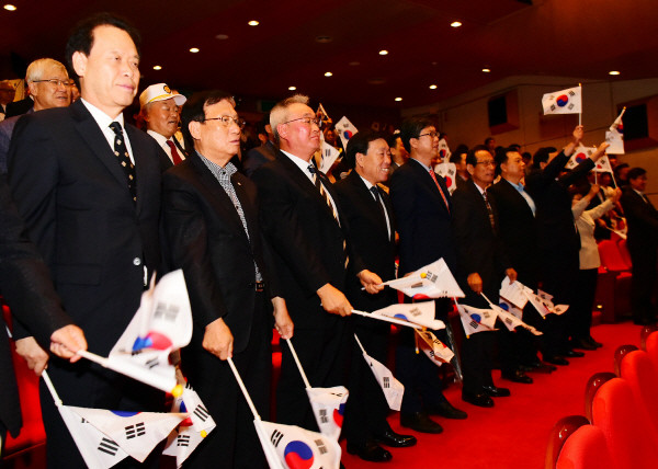 지난 15일 경기 안산문화예술의전당 달맞이극장에서 광복 제72주년을 기념해 '광복절 경축식'이 개최됐다. 사진은 제종길 시장(왼쪽에서 네번째)과 참석자들이 태극기를 들고 행사에 참여하고 있는 모습.