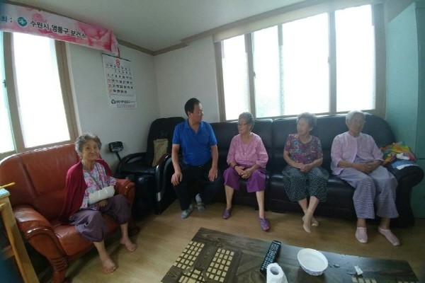 경기 수원시 영통구 매탄1동 주민자치위원회에서는 최근 지역내 경로당을 방문해 장마와 더위로 지친 노인들을 살폈다. 사진은 위원회 관계자가 노인들과 이야기를 나누는 모습.(사진제공=영통구청)