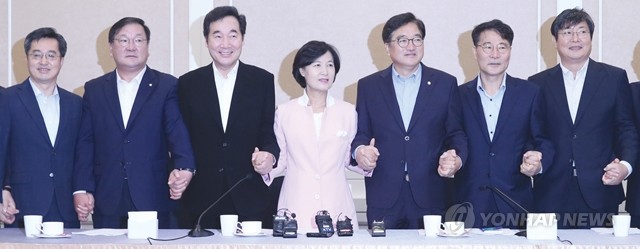 더불어민주당 추미애 대표, 이낙연 국무총리, 장하성 청와대 정책실장 등이 16일 오전 국회에서 열린 고위 당정청회의에서 손을 잡고 기념촬영을 하고 있다.