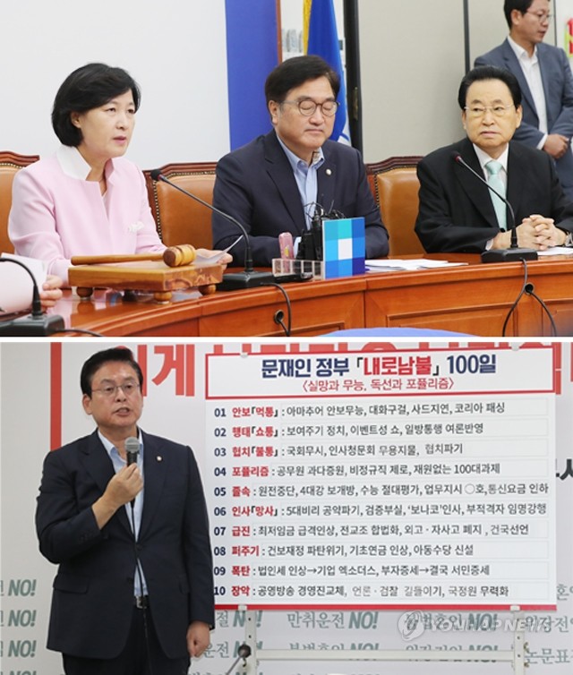더불어민주당 추미애 대표가 16일 오전 국회에서 열린 최고위원회의에서 발언하고 있다(위). 자유한국당 정우택 원내대표가 16일 오전 국회에서 문재인 정부 100일 평가 기자회견을 하고 있다(아래).