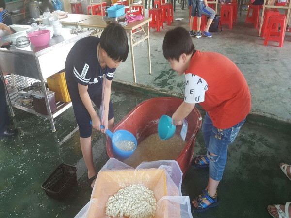 서울 은평구 대조동주민센터와 주민자치위원회가 최근 지역내 초등학생 18명을 대상으로 충남 예산군 대흥면 의좋은 형제마을에서 ‘2017년 여름방학 농촌체험교실’을 실시했다. 사진은 ‘두부 만들기’를 체험하고 있는 어린이들의 모습.(사진제공=은평구청)