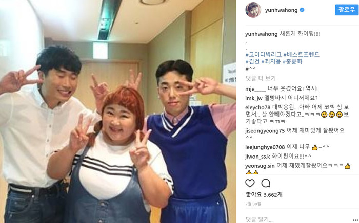 지난 30일 홍윤화는 자신의 SNS에 "새롭게 화이팅!"이라는 글과 함께 "#코미디빅리그 #베스트프렌드 #김건 #최지용 #홍윤화" 라는 해시태그를 게재했다.