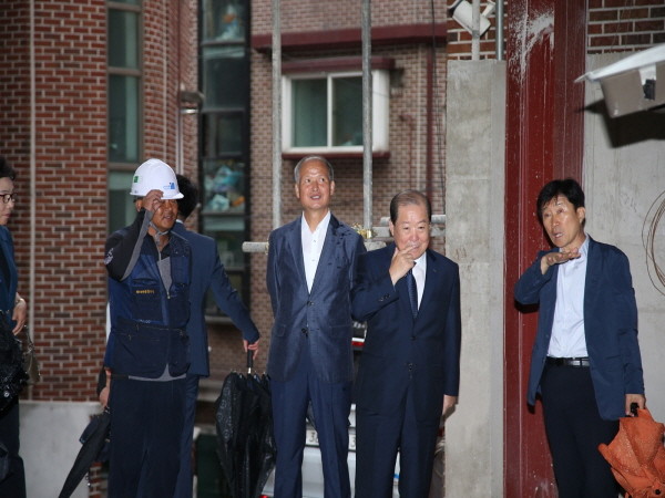 지난 14일 박홍섭 서울 마포구청장(오른쪽에서 두번째)이 공덕동 7-134번지 일원에서 진행 중에 있는 공덕동 공영주차장 증축 및 리모델링 공사 현장에 방문해 현장을 둘러보고 있다. 공덕동 공영주차장은 9월 말 준공 예정이다.(사진제공=마포구청)