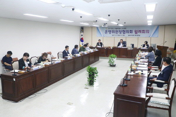 [시민일보=이대우 기자] 서울시 자치구의회 운영위원장들이 모여 좋은 정책과 모범적인 사례들을 공유하는 ‘2017년도 서울특별시 구의회 8월 운영위원장협의회 월례회의’가 송파구의회(의장 안성화) 3층 제1회의실에서 최근 열렸다.